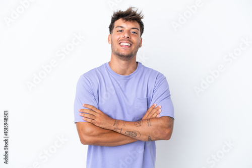 Obraz premium Young caucasian handsome man isolated on white background keeping the arms crossed in frontal position