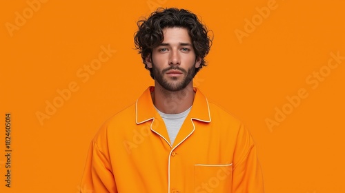 Fototapeta premium Young caucasian male in orange outfit against orange background