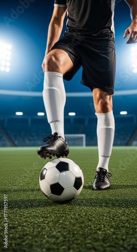 © Space Priest, Fototapeta premium Young caucasian male soccer player balancing ball on field under stadium lights