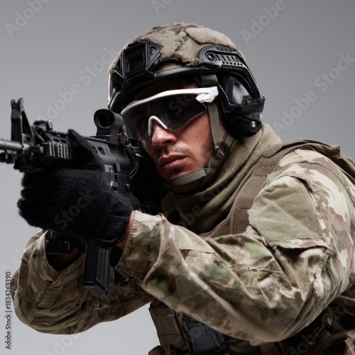 Obraz premium Young caucasian male soldier in tactical gear aiming rifle