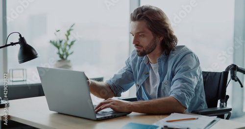 Fototapeta premium Young caucasian man disabled in wheelchar coming to office corporate workspace sitting by desk using computer laptop.
