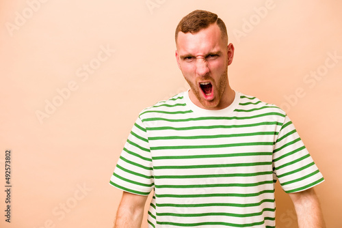 Fototapeta premium Young caucasian man isolated on beige background shouting very angry, rage...