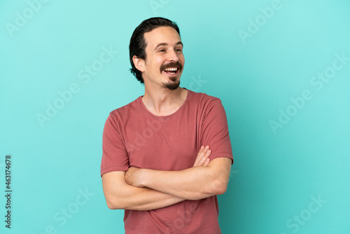 Obraz premium Young caucasian man isolated on blue background happy and smiling