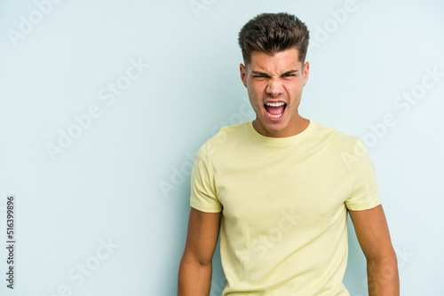 Fototapeta premium Young caucasian man isolated on blue background shouting very angry, rage...
