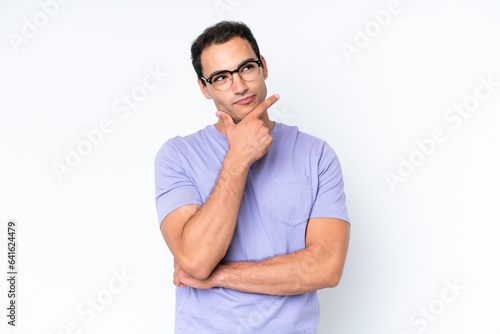 Fototapeta premium Young caucasian man isolated on white background thinking an idea while...