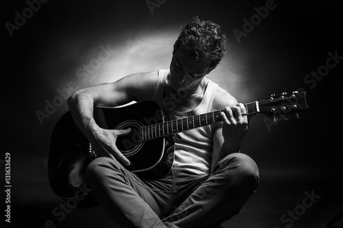 Naklejka premium Young caucasian man play a acoustic guitar. Black and white picture, low key...