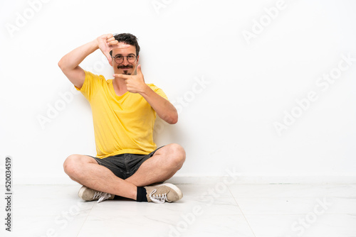 Fototapeta premium Young caucasian man sitting on the floor isolated on white background focusing face. Framing symbol