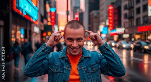 © Margarita Ratatosk, Obraz premium Young caucasian man smiling with short hair against blurred city lights. Male in blue denim jacket showing shaved head hair. Hair beauty.