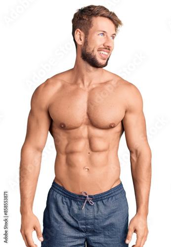 Fototapeta premium Young caucasian man standing shirtless looking away to side with smile on face, natural expression. laughing confident.