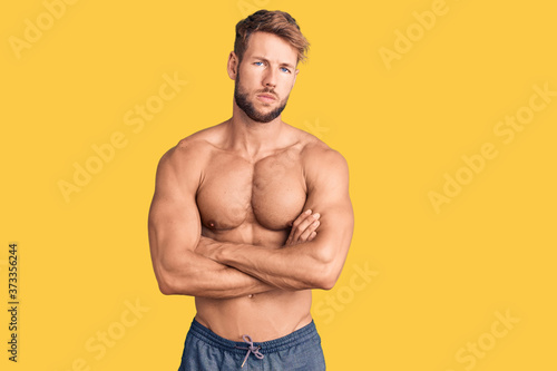 Fototapeta premium Young caucasian man standing shirtless skeptic and nervous, disapproving expression on face with crossed arms. negative person.