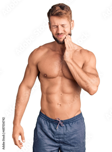Fototapeta premium Young caucasian man standing shirtless touching mouth with hand with painful expression because of toothache or dental illness on teeth. dentist