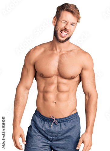 © Krakenimages.com, Fototapeta premium Young caucasian man standing shirtless winking looking at the camera with sexy expression, cheerful and happy face.