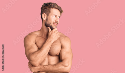 Fototapeta premium Young caucasian man standing shirtless with hand on chin thinking about...
