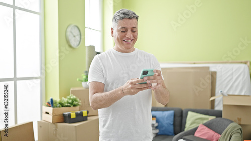 Fototapeta premium Young caucasian man using smartphone standing at new home