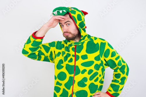 © Roquillo, Fototapeta premium Young caucasian man wearing a pajama standing against white background having problems, worried and stressed holds hand on forehead.