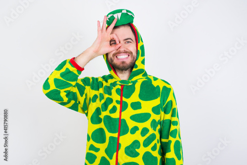 © Jihan, Fototapeta premium young caucasian man wearing a pajama standing against white wall doing ok gesture with hand smiling, eye looking through fingers with happy face.