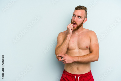 Fototapeta premium Young caucasian man wearing a swimsuit isolated on blue background relaxed thinking about something looking at a copy space.