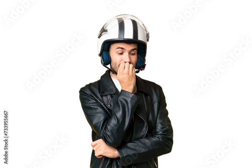 Fototapeta premium Young caucasian man with a motorcycle helmet over isolated chroma key...