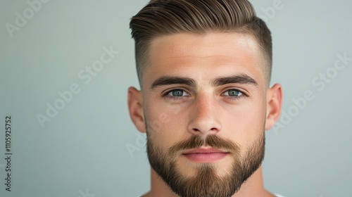 © ECLIVN, Fototapeta premium Young Caucasian man with stylish haircut and beard, showcasing a confident expression against a soft gray background.