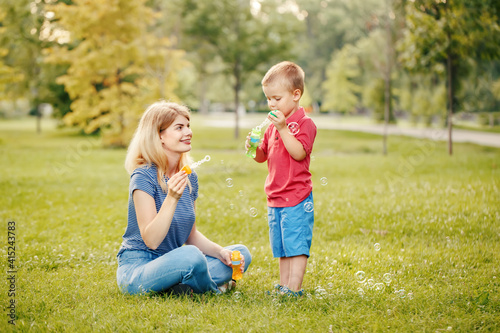 Fototapeta premium Young Caucasian mother and boy toddler son blowing soap bubbles in park. Mom...