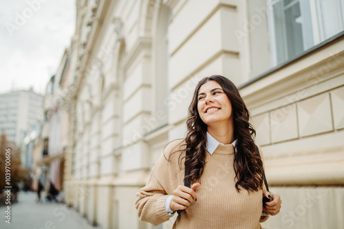 © Dusan, Fototapeta premium Young caucasian smiling woman student going to university