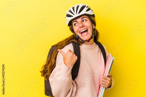 Fototapeta premium Young caucasian student woman wearing a bike helmet isolated on yellow background points with thumb finger away, laughing and carefree.