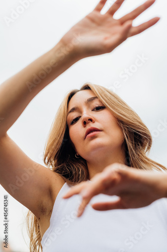 © Eugenio Marongiu, Fototapeta premium Young caucasian woman dancing outdoor gesturing with hands feeling free