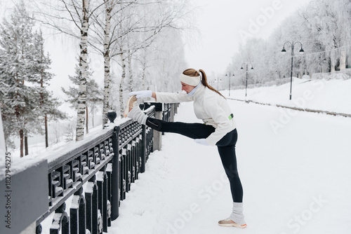 Naklejka premium young caucasian woman doing stretching exercises before running in park in winter, white sports jacket, black trousers, active lifestyle concept, jogging in winter, sports life, copy space