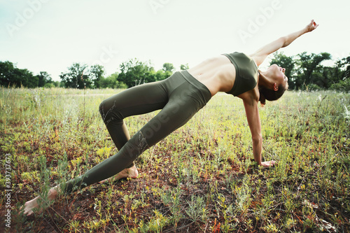 © Myshkovskyi, Fototapeta premium Young Caucasian woman doing yoga in a meadow at sunset.