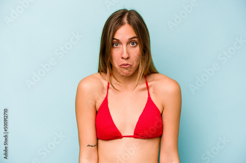 © Asier, Fototapeta premium Young caucasian woman going to the beach isolated on blue background shrugs shoulders and open eyes confused.