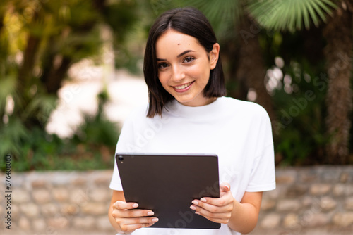 Fototapeta premium Young caucasian woman holding a tablet at outdoors