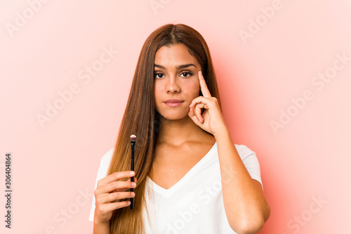 Fototapeta premium Young caucasian woman holding an skinbrush pointing his temple with finger,...
