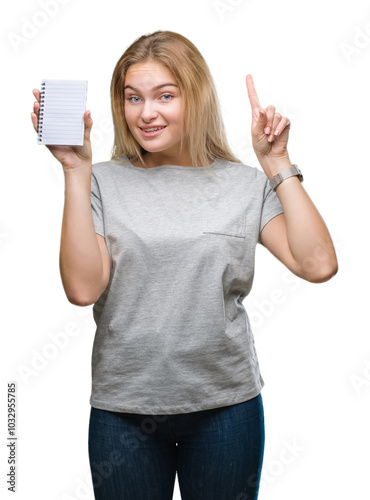 © Krakenimages.com, Obraz premium Young caucasian woman holding blank notebook over isolated background surprised with an idea or question pointing finger with happy face, number one