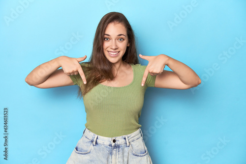© Asier, Fototapeta premium Young Caucasian woman in a green top on a blue backdrop points down with fingers, positive feeling.