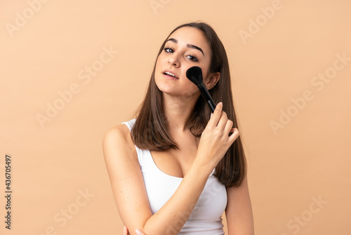 Fototapeta premium Young caucasian woman isolated on beige background holding makeup brush