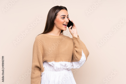 Fototapeta premium Young caucasian woman isolated on beige background keeping a conversation with the mobile phone