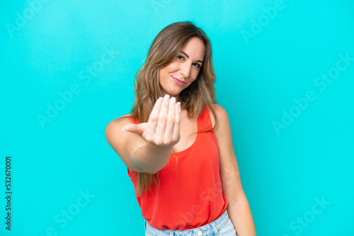 Fototapeta premium Young caucasian woman isolated on blue background inviting to come with hand....