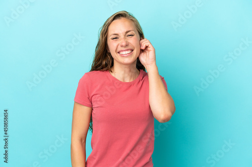 Fototapeta premium Young caucasian woman isolated on blue background laughing