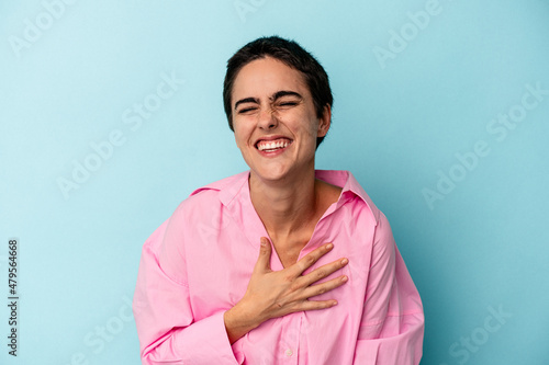 Obraz premium Young caucasian woman isolated on blue background laughs out loudly keeping hand on chest.