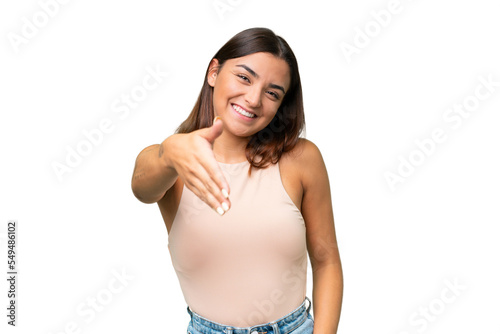 Fototapeta premium Young caucasian woman isolated on green chroma background shaking hands for...