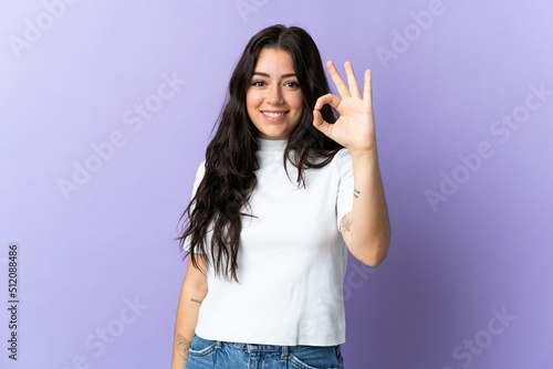 Fototapeta premium Young caucasian woman isolated on purple background showing ok sign with fingers