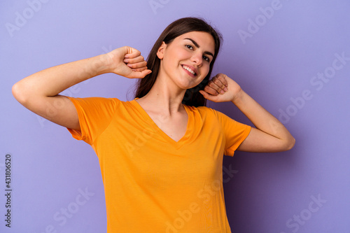 Fototapeta premium Young caucasian woman isolated on purple background stretching arms, relaxed...