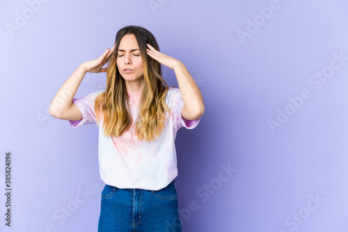 Fototapeta premium Young caucasian woman isolated on purple background touching temples and having headache.