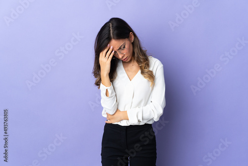 Fototapeta premium Young caucasian woman isolated on purple background with headache