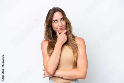 Fototapeta premium Young caucasian woman isolated on white background and looking up
