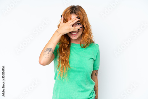 © luismolinero, Fototapeta premium Young caucasian woman isolated on white background covering eyes by hands and smiling