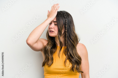 Obraz premium Young caucasian woman isolated on white background forgetting something, slapping forehead with palm and closing eyes.