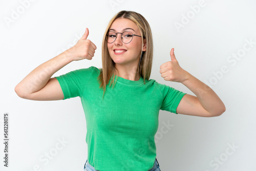 Fototapeta premium Young caucasian woman isolated on white background giving a thumbs up gesture