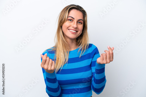 Fototapeta premium Young caucasian woman isolated on white background making money gesture