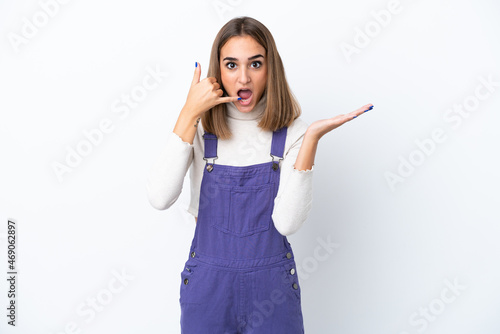 Fototapeta premium Young caucasian woman isolated on white background making phone gesture and...